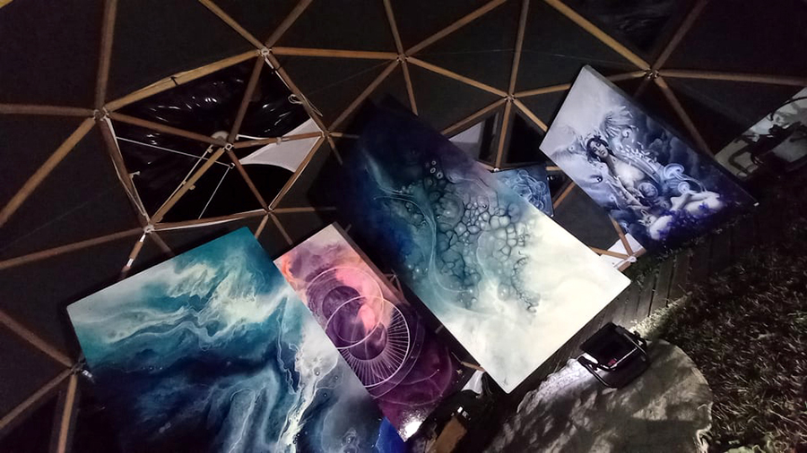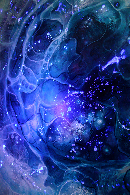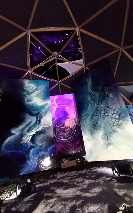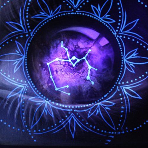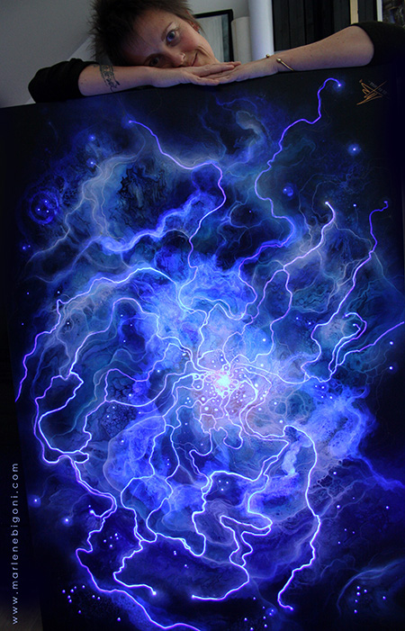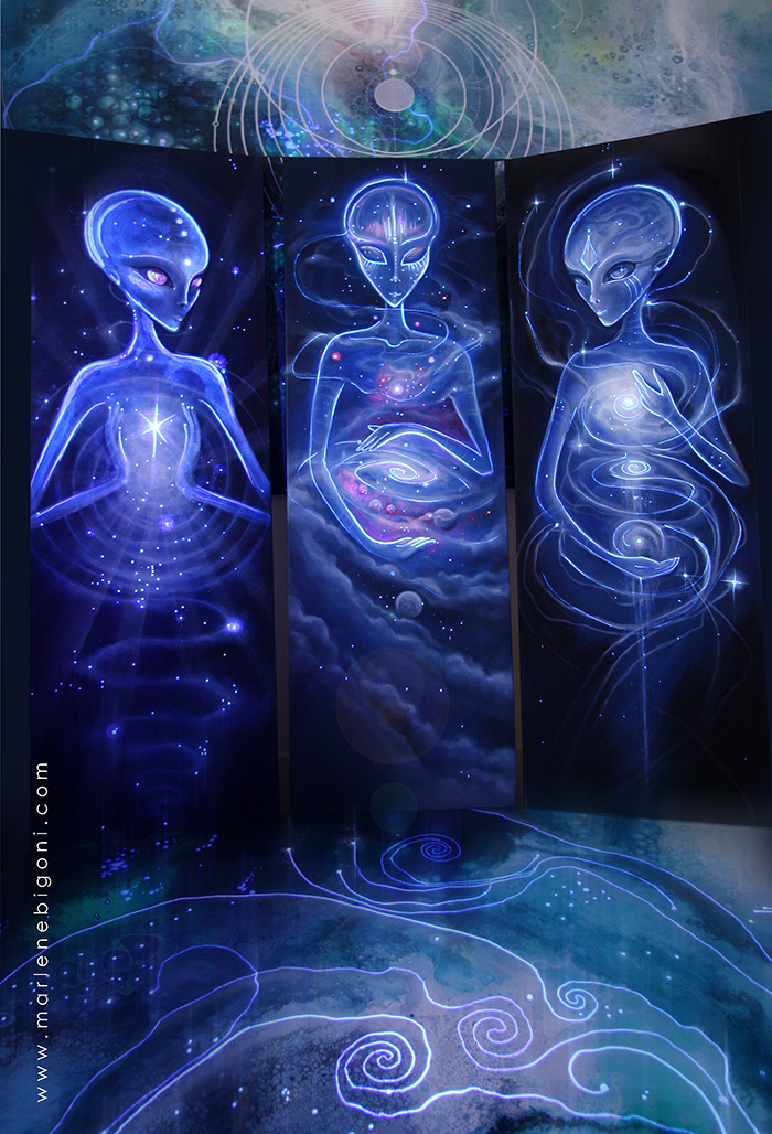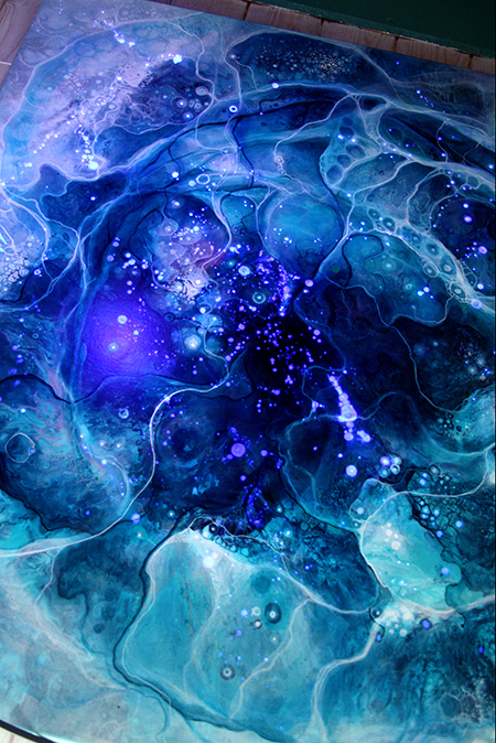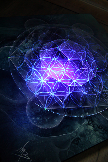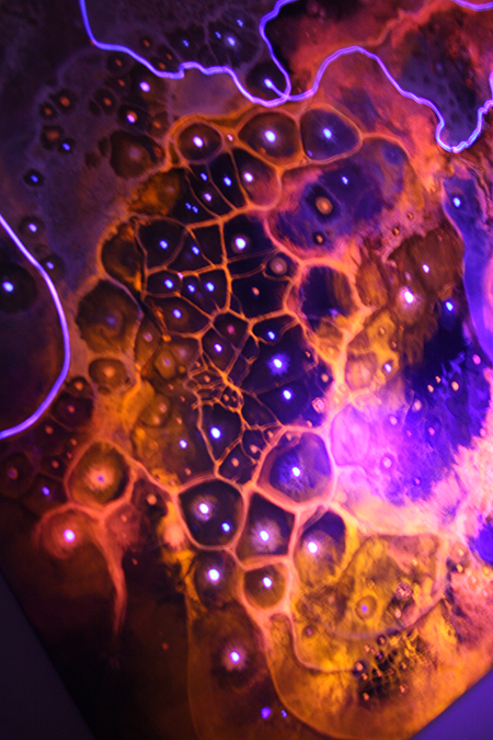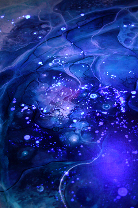 Les encres ultraviolettes se révellent sous une lampe à U.V, offrant une nouvelle lecture et une autre dimension à la peinture. "Ce n'est pas parce que les choses sont invisibles, qu'elles n'existent pas."